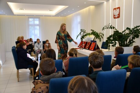 Uczniowie mieli także okazję zajrzeć do gabinetu Przewodniczącego Rady Miasta. Z zainteresowaniem obejrzeli łańcuch zakładany podczas uroczystych sesji oraz zabytkowy, stary zegar. Zwrócili także uwagę na portret Józefa Piłsudskiego wiszący na ścianie, co przyciągnęło ich uwagę w kontekście obchodów Święta Niepodległości poprzedniego dnia.