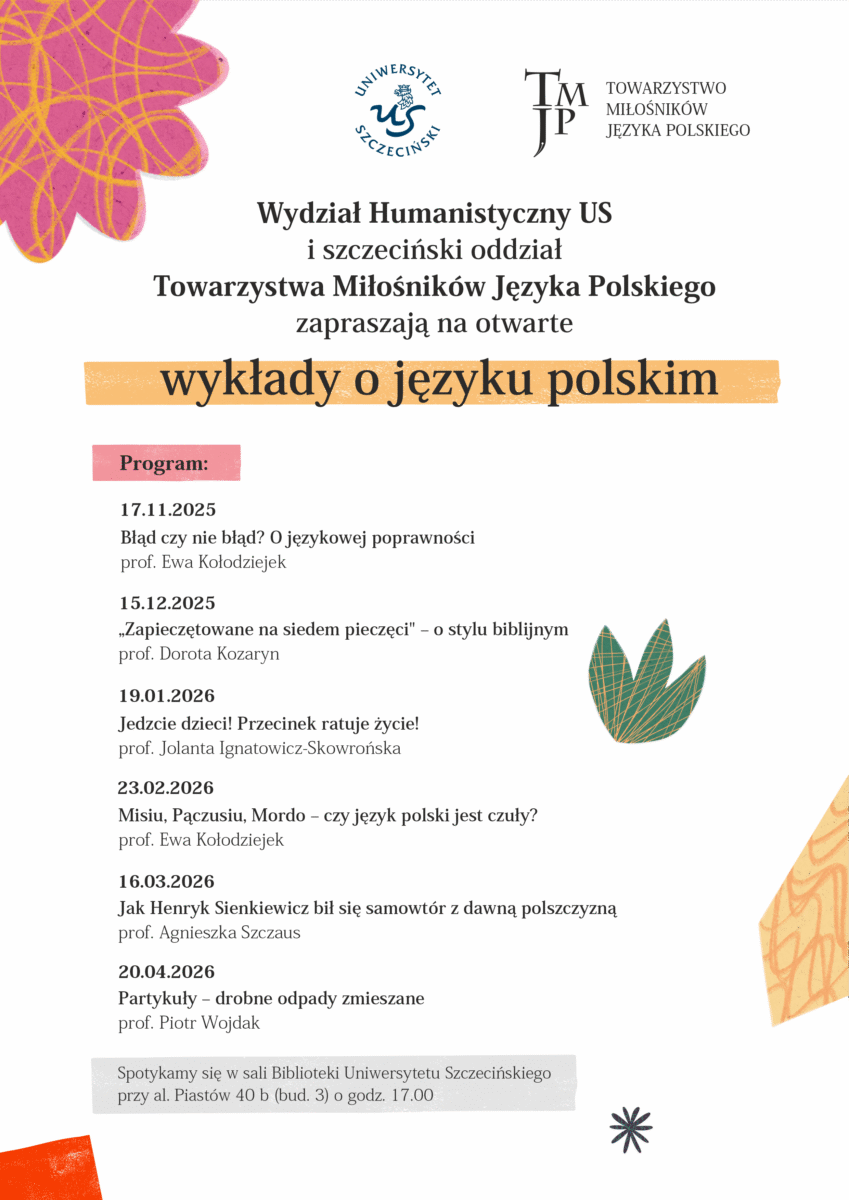 Wydział Humanistyczny Uniwersytetu Szczecińskiego i szczeciński oddział Towarzystwa Miłośników Języka Polskiego po raz kolejny organizują cykl prelekcji zatytułowany „Wykłady o języku polskim”. Jest to inicjatywa skierowana do szerokiego grona odbiorców: uczniów, studentów oraz mieszkańców Szczecina i regionu.