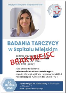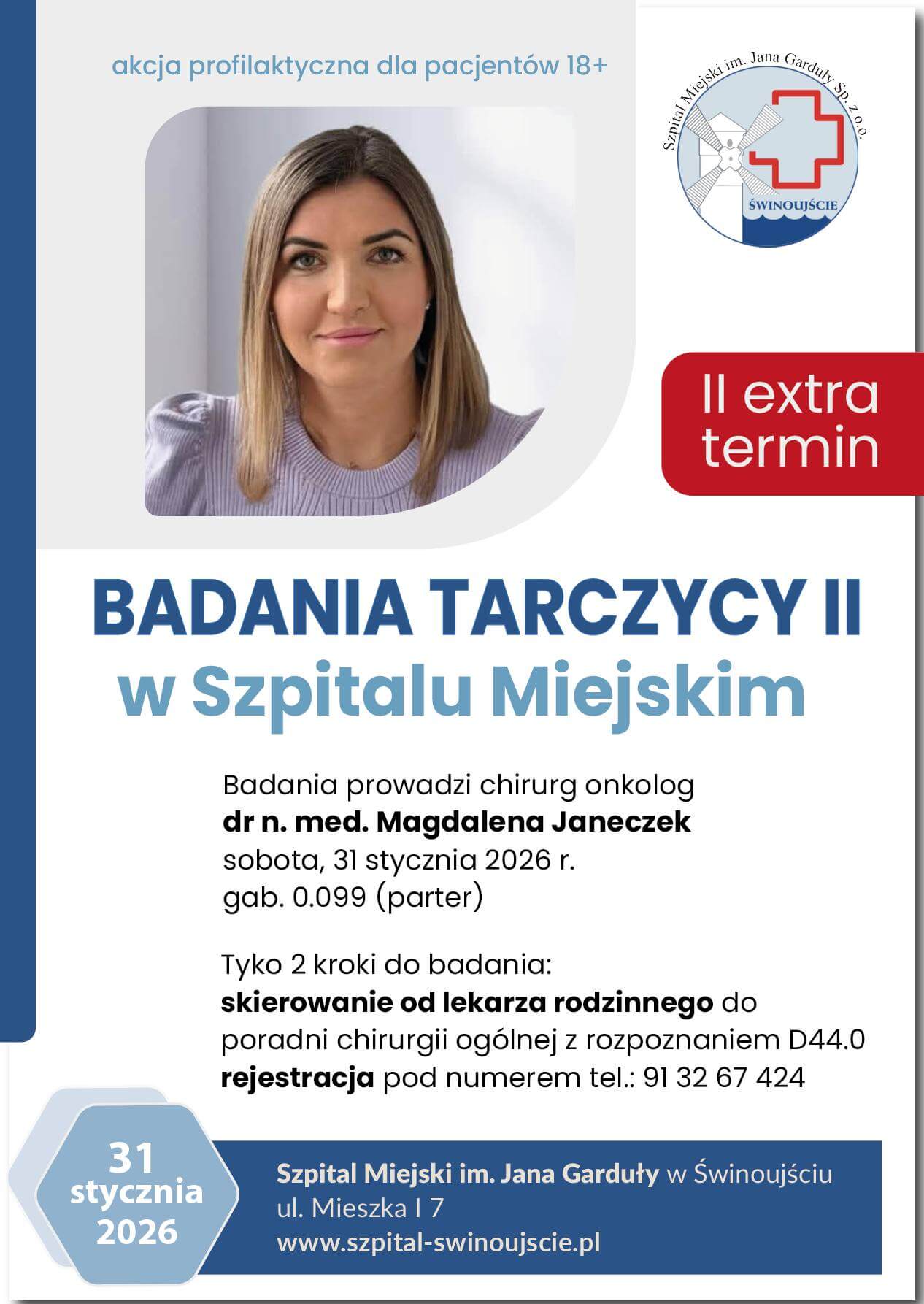 Szpital Miejski im. Jana Garduły w Świnoujściu zaprasza mieszkańców na bezpłatne badania tarczycy, które odbędą się 31 stycznia 2026 r. To kolejna akcja profilaktyczna skierowana do lokalnej społeczności – szczególnie istotna, ponieważ problemy z tarczycą często rozwijają się po cichu i przez długi czas pozostają niezauważone.