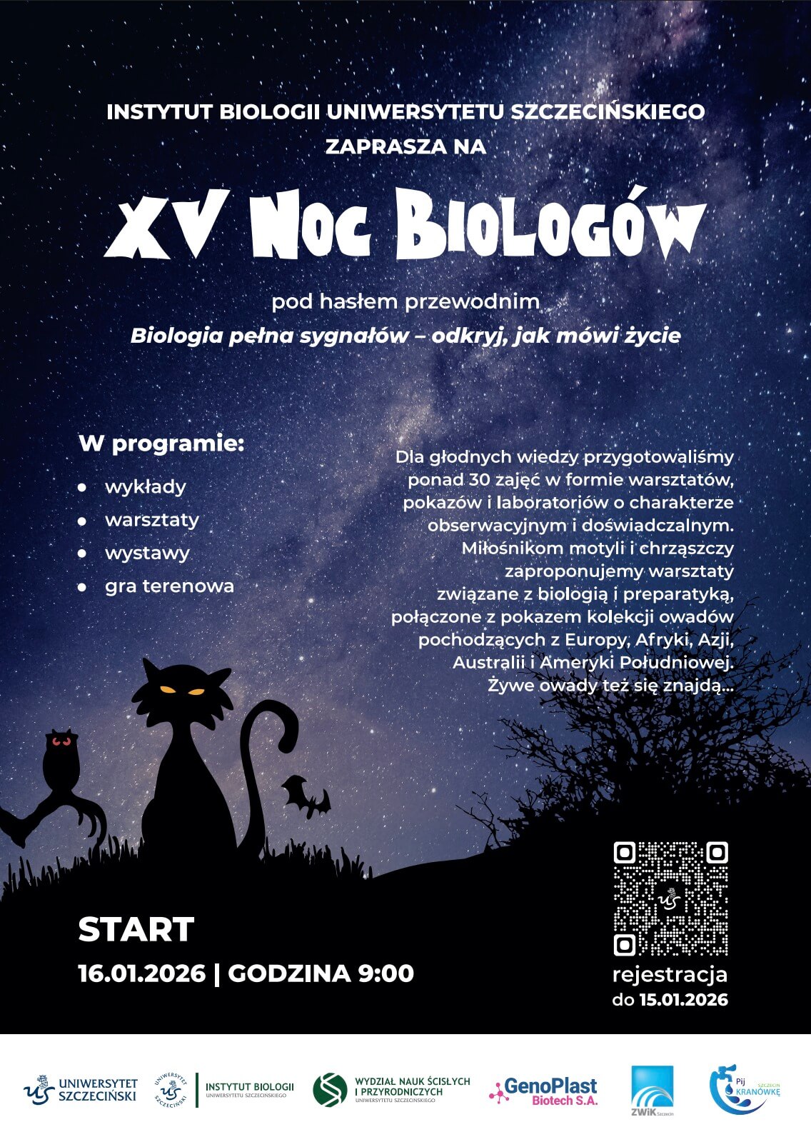 Tegoroczna Noc Biologów rozpocznie się 16 stycznia 2026 r. w Instytucie Biologii US przy ul. Wąskiej 13 w Szczecinie. Zaplanowano ponad 30 aktywności – w tym wykłady popularnonaukowe, warsztaty, pokazy oraz zajęcia laboratoryjne o charakterze obserwacyjnym i doświadczalnym. W programie przewidziano również wystawy i grę terenową.